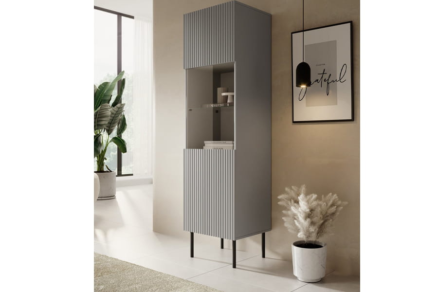 Witrynka z kolekcji Asensio to idealne rozwiązanie dla osób, które chcą wyeksponować swoje zbiory lub ozdoby, a jednocześnie chcą mieć pewną prywatność i możliwość przechowywania rzeczy, które niekoniecznie muszą być widoczne dla wszystkich. Posiada ona tylko częściowo przeszklone fronty, część jest wykonana z płyty meblowej z dekoracyjnymi ryflami, co ułatwia nam utrzymanie porządku we wnętrzu.