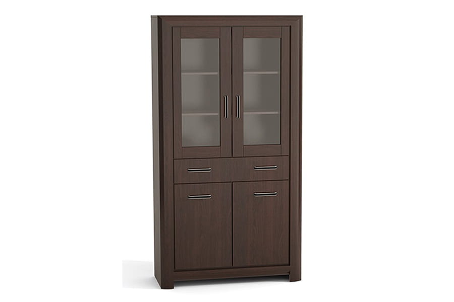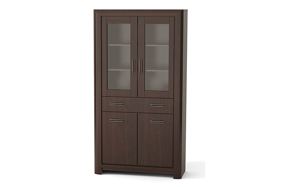 - witryna posiada dwudrzwiowy przeszklony front, pojemną szufladę oraz szafkę dwudrzwiową