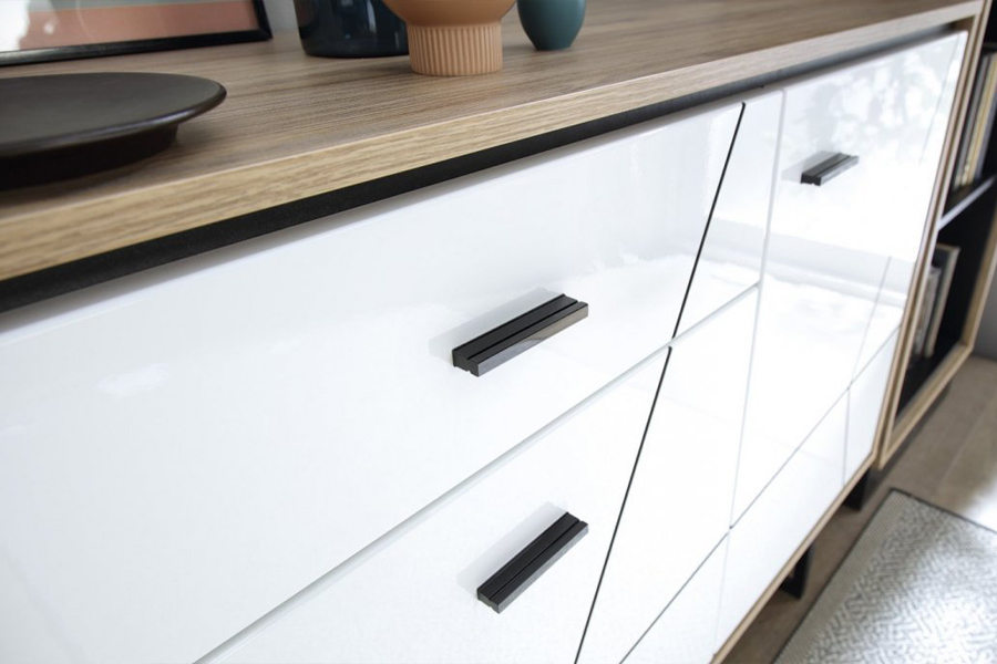 - Przeszklone fronty nadają witrynie lekkości a szklane półki wewnątrz pozwalają na wyeksponowanie elementów dekoracyjnych, które możemy dodatkowo podswietlić.