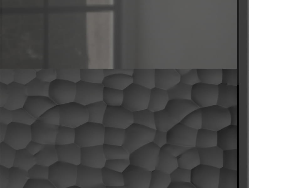 Kolekcja Bullet to bardzo elegancki i stylowy sposób na odświeżenie wnętrza. Meble są wykonane z płyty meblowej, w kolorze czarnym, z dekorem 3D w formie wgłębień na frontach. Złoty detal w postaci cienkich nóżek sprawia, ze całość wygląda bardzo elegencko i luksusowo. Dodatkowo meble w kolorze czarnym doskonale dopasują się do różnych stylów wnętrzarskich, od nowoczesnego po klasyczny. Witrynka jest meblem niezbędnym w każdym salonie czy jadalni. Ta z kolekcji Bullet, ze względu na ciekawy dekor i czarne wybarwienie, odnajdzie się również w gabinecie, gdzie wyeksponujemy na niej książki, albumy czy inne pamiątki. Elegancka forma i wstawki z szyby, gdzie możemy umieścić dodatkowo dekoracyjne elementy, sprawi, ze mebel taki będzie dekoracją w niejednym wnętrzu.