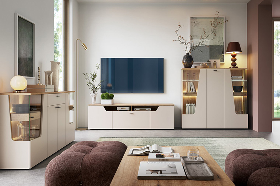 W kolekcji Cut Out matowy kaszmir gra pierwsze skrzypce, ale to jego połączenie z ciepłym dekorem Dąb Coast Evoke oraz przeszkleniami w bokach witryn i komód nadaje meblom wyjątkowego charakteru. Dodatkowe oświetlenie LED (w zestawie) efektownie podkreśla zawartość mebli, tworząc przytulną atmosferę sprzyjającą wspólnym chwilom.