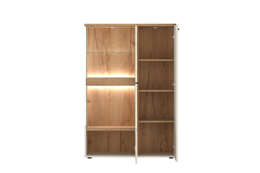 W kolekcji Cut Out matowy kaszmir gra pierwsze skrzypce, ale to jego połączenie z ciepłym dekorem Dąb Coast Evoke oraz przeszkleniami w bokach witryn i komód nadaje meblom wyjątkowego charakteru. Dodatkowe oświetlenie LED (w zestawie) efektownie podkreśla zawartość mebli, tworząc przytulną atmosferę sprzyjającą wspólnym chwilom.
