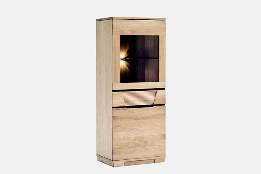- posiada 1 pełne drzwi, 1 szufladę oraz 1 front szklany. W witrynie z pewnością można pomieścić wiele rzeczy w zależności od potrzeb, część wyeksponować za szybką, a resztę schować do podręcznej szuflady czy dolnej szafki.