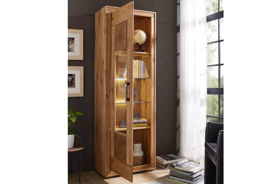 - Witryna jednodrzwiowa jest przeszklona. Wewnątrz znajdują się 2 szklane półki oraz 2 drewniane