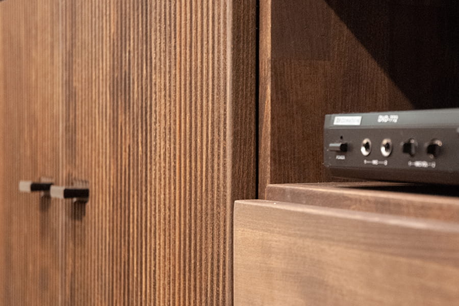 - Witryna 2-drzwiowa z jedną szklaną półką oraz dwoma półkami drewnianymi