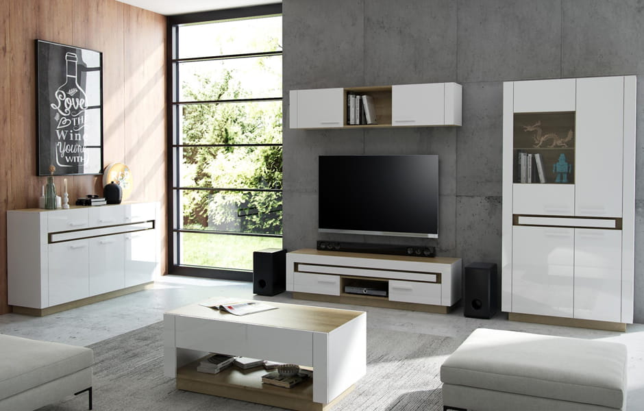 Kolekcja Lineo to nowocześnie zaprojektowany zestaw mebli modułowych, z którymi zaaranżujesz salon, jadalnię oraz sypialnię. Innowacyjne połączenie lśniącej, bieli z blatami oraz wstawkami w dębie riviara i graficie tworzy zgraną, spójną całość. Kolekcja obejmuje szereg funkcjonalnych elementów: komód, witryn, szaf, szafek i półek. Dopasowane do całości uchwyty gustownie komponują się z całością, ułatwiając korzystanie z mebli. Kolekcja Bari to fuzja kształtów i kolorów, będąca ikoną nowoczesności.