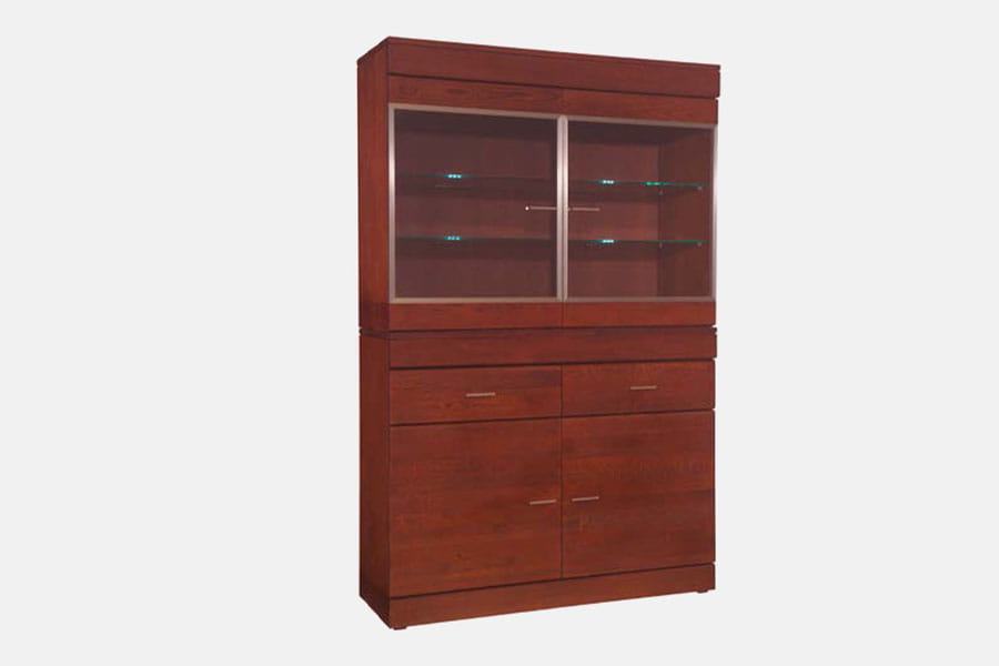 - witryna z górną częścią oszkloną w dolnej znajduje się szafka a po środku dwie szuflady
