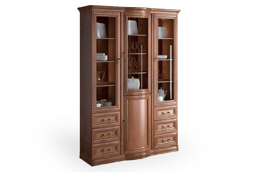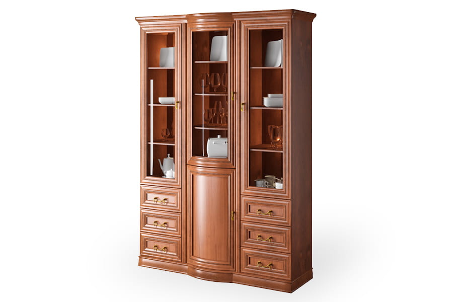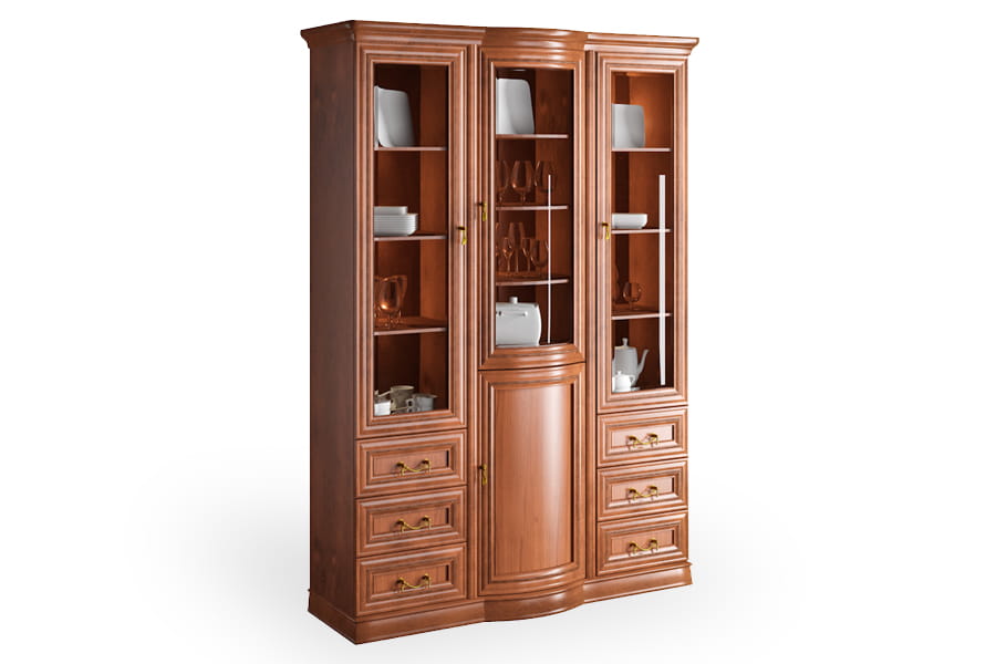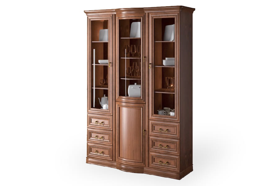 Witryna Rupert 3D-SDS firmy Latzke świetnie wkomponuje się w przestronne i elegancko umeblowane wnętrze. Jest pięknie wykończona, ponieważ posiada rzeźbione detale oraz delikatnie łamany zaokrągloną linią front. Te elementy wraz z ozdobnymi uchwytami są oznaką elegancji i kunsztu klasycznego rzemiosła. Zachwycać może także pojemność witryny Rupert, która posiada liczne szuflady, szafkę oraz mnóstwo miejsca w oszklonych segmentach, które przeznaczysz do wyeksponowania cennych przedmiotów. Ich wyjątkowość podkreślisz dodatkowym oświetleniem. Witryna wykonana jest z wysokiej jakości materiałów, które dbają o jej wysoką trwałość i odporność na niszczenie. Domyślny kolor dla tego produktu to czereśnia liguryjska.