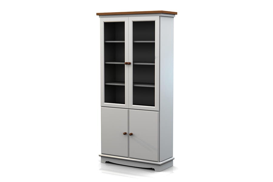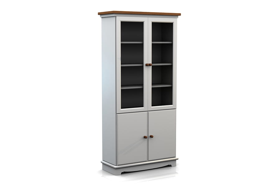- witryna podzielona na część przeszkloną oraz dolny segment w postaci szafki dwudrzwiowej