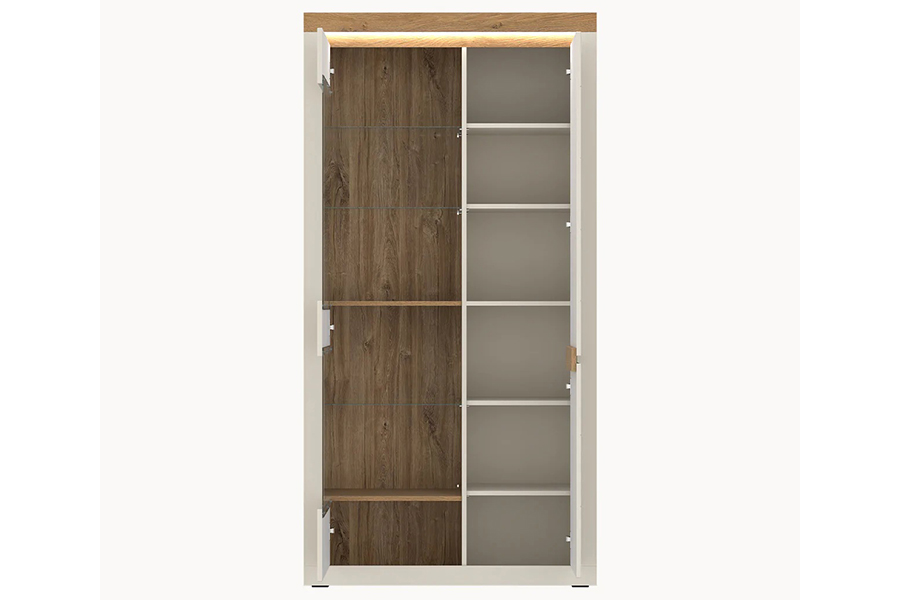 - Liczne półki (co najmniej pięć) pomagają uporządkować zastawę, szkło czy dekoracje tematycznie lub według rozmiaru. Wysokość 204,7 cm zapewnia dużą pojemność, a głębokość 39,6 cm pozwala ustawić mebel także w węższych ciągach komunikacyjnych, oszczędzając miejsce w pokoju dziennym, jadalni czy gabinecie.
