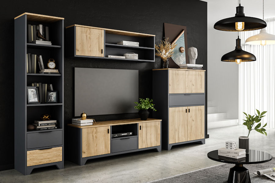 Kolekcja LARA to połączenie nowoczesnego designu z funkcjonalnością, idealne do salonu, jadalni czy gabinetu. Wyraziste zestawienie antracytowych korpusów z frontami w wybarwieniu imitującym naturalne drewno nadaje wnętrzu wyjątkowego charakteru – z jednej strony przytulnego, z drugiej eleganckiego i ponadczasowego. Lara składa się z mebli takich jak: komoda dwudrzwiowa, komoda trzydrzwiowa z szufladą lub bez, półka ścienna, jednodrzwiowy regał, szafa, witryna jednodrzwiowa lub dwudrzwiowa, szafka RTV oraz opcjonalne wyposażenie szafy. Z kolekcją LARA stworzysz wnętrze, które zachwyca stylem i komfortem użytkowania. To propozycja dla osób, które cenią sobie nowoczesny design w połączeniu z naturalnym, drewnopodobnym wykończeniem.