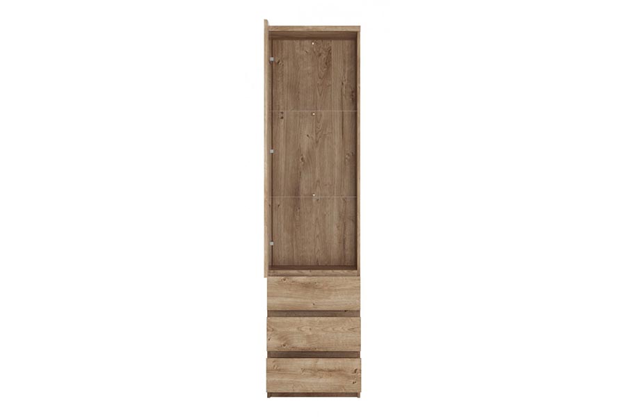 - Kompaktowa witryna o geometrycznym kształcie to propozycja, która sprawdzi się w mieszkaniach o małych metrażach. We wnętrzu witryny znajdują się aż trzy pojemne szuflady z łatwym dostępem do zawartości oraz szklane półki, na których można wyeksponować ciekawe dodatki oraz pięknie je podświetlić oświetleniem opcjonalnym (do zakupu oddzielnie). Drzwi witryny zostały wyposażone w bezpieczne szkło hartowane oraz system bezuchwytowy, który nie tylko jest wygodny w użytkowaniu, ale zapewnia również nowoczesny wygląd mebli. Mebel wykonany jest z płyty wiórowej laminowanej w kolorze Dąb Ribbeck Złoty z widocznym usłojeniem i delikatną, ale wyczuwalną fakturą drewna. Program występuje w dwóch wybarwieniach: Dąb Ribbeck Złoty i Biel Alpejska.