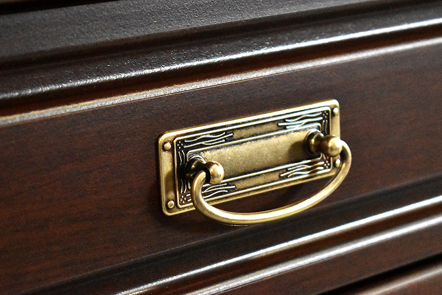 - Klasyczny styl mebli podkreślają ozdobne korony oraz metalowe stylizowane uchwyty.